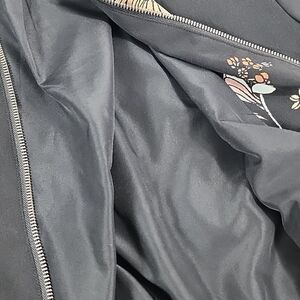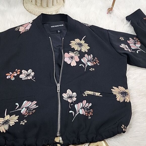 Super cute floral Bomber jacket with a lightweight feel, zippered close, satin lining, 2 faux front pockets and a braided drawstring at bottom hem