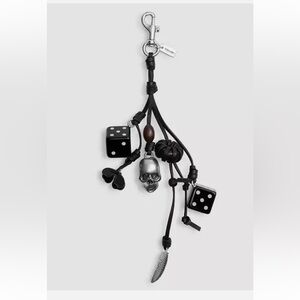Stylish black leather keychain featuring a skull and dice charms. Perfect for adding an edgy touch to your accessories. Worn a few times like new