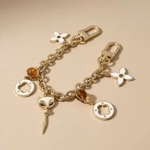 Elegant gold and white bag charm featuring floral accents and unique charms.