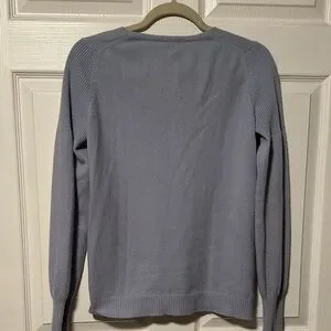 Elegant V-neck sweater in light blue. Soft and comfortable. Ideal for layering. An excellent use condition length is 25 inches chest is 19 inches.