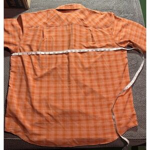 This Orvis shirt is a men's size 2XL in a vibrant orange color, featuring a stylish plaid pattern with short sleeves and a button-up closure. Made from lightweight and breathable polyester microfiber material, it is designed for outdoor activities like construction and sports like fishing with vented performance features. Durable but comfortable. The shirt is machine washable and suitable for both casual and workwear occasions, offering a regular fit for comfort during the summer, fall, and spring seasons.