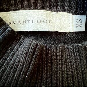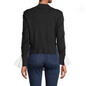 Chic and stylish black sweater in a soft knit blend, mock turtleneck, long sleeves, frayed texture, cotton ruffle edge at cuffs & hem, pullover style. Perfect for a modern, layered look.