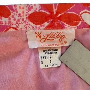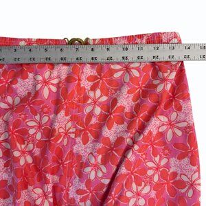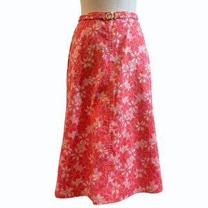 Vintage Lilly Pulitzer wrap skirt featuring a pink and red ditzy floral pattern. Belted with a buckle for a charming look. Perfect for casual outings or a summer day.