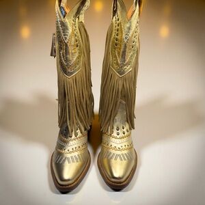 The boots are made of leather and feature fringe around the upper. Step into style with Dingo's gold heeled boots, featuring a captivating fringe that adds a touch of drama. and studded detail. These boots combine the elegance of a pointed toe with the allure of Western-inspired design, making them a standout choice for any occasion.