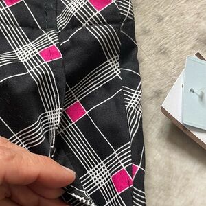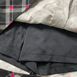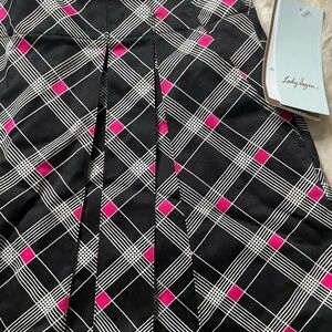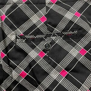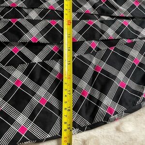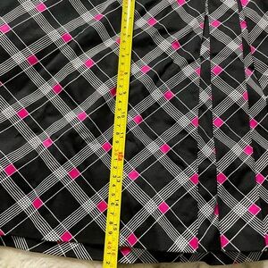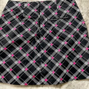 Chic A-line skirt with a bold checkered design. Features black base with pink accents. Ideal for versatile styling.