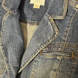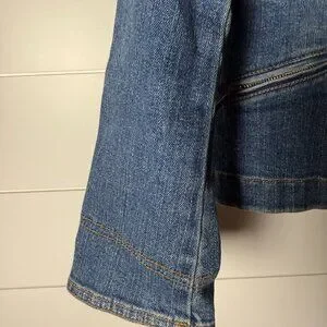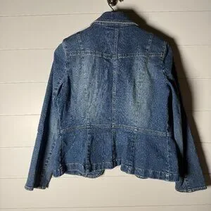 Chic denim jacket with tailored fit. Features button closure and front pockets. Ideal for layering.