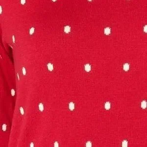 Chic red sweater with white polka dots. Long sleeves. Comfortable fit.