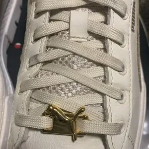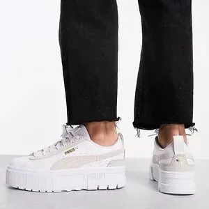 Elevate your sneaker game with these stylish cream and tan leather and suede Puma Mayze Platform Sneakers. Designed with women in mind, these athletic shoes feature a lace-up closure and gold Puma shoelace charms for a touch of glamour. The Puma Mayze model is part of the Platform line, making them not only fashionable but also comfortable for all-day wear.