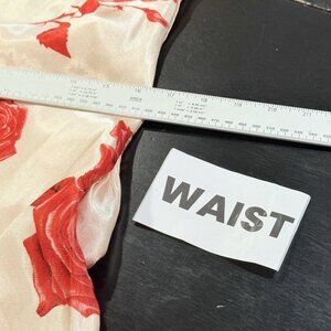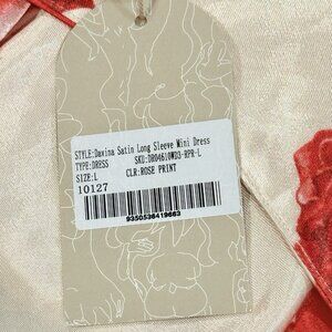 The NWT Meshki Davina Women's Large Satin Long Sleeve Backless Floral Red Mini Dress is a stylish and versatile piece perfect for various occasions such as weddings, parties, and even casual outings. The dress features a beautiful rose floral pattern, a boat neckline, and long bell sleeves, giving it a trendy and feminine look. Made from a combination of polyester and viscose, the dress is designed for comfort and durability. The backless feature adds a touch of elegance, while the vibrant red color adds a pop of color to your wardrobe. Hand wash only to maintain its quality, this dress is a must-have for any fashion-forward woman.