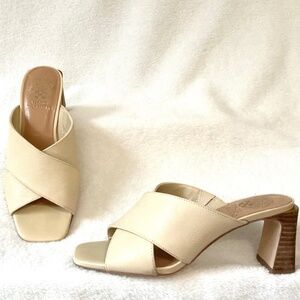 TAN VINCE CAMUTO HEMILA LEATHER CROSSOVER SLIP ON BLOCK HEEL SANDAL SZ 7.5M/38