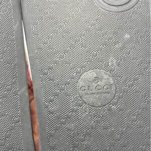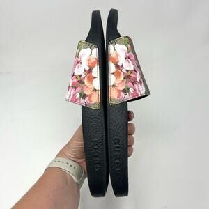 Stylish Gucci sandals with floral design. Features black base and multicolor floral strap.
