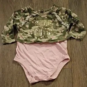 Adorable kids one piece featuring a stylish camouflage pattern with pink accents. Perfect for your little one's wardrobe.