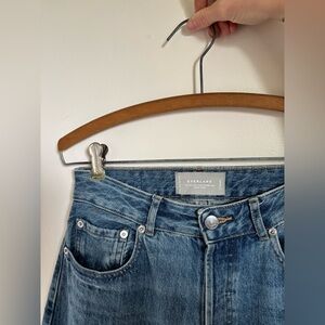 Everlane The Curvy 90s Cheeky Straight Jean in the color vintage mid blue- quality stiff denim, with a straight leg fit. High rise fit, and 100% organic cotton. Sold out online.