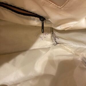 Dimensions noted in photos, as well as some stains in the lining and outside of the bag. I don't think the lining stains can come out but the ones on the outside of the bag are small and should be easy to spot clean.