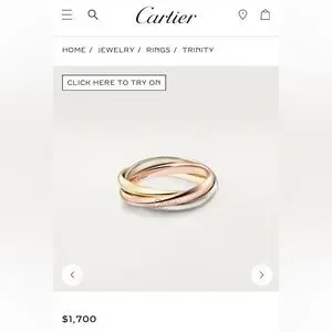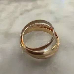 Cartier Trinity ring small model in size 52 which is equivalent to a size 6 in US sizing. This ring is 18k yellow, rose and white gold, 3 rings in one. In VERY good pre-owned condition, only worn a handful of times. Comes with ring box, outer box and certificate of authenticity as shown in picture. Ring will go to Posh to be authenticated first.