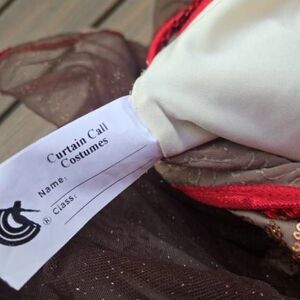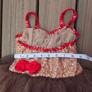 Unleash her inner performer with this Curtain Call dance dress! Featuring a playful blend of brown, red and beige, it's adorned with a shimmering bodice and a delightful tulle skirt that twirls like a dream. With a cheeky monkey tail adding to the fun, this kid's small outfit is perfect for stage or playtime. Get ready to steal the spotlight! Make an offer!