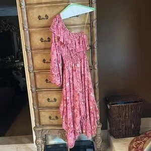Elegant one-shoulder midi dress. Features pink floral pattern. Ruffled details add charm. Perfect for any occasion. I wore this one time to a wedding. It has just been dry cleaned Excellent condition