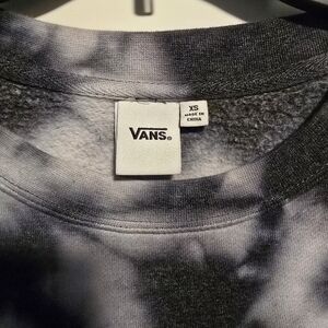 Vans tie-dye sweatshirt with a bold logo. Features black and white tie-dye pattern with red accents