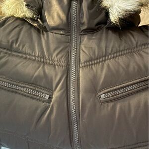 Nautica brown puffer jacket with a cozy faux fur hood. Features silver zipper accents and multiple pockets.