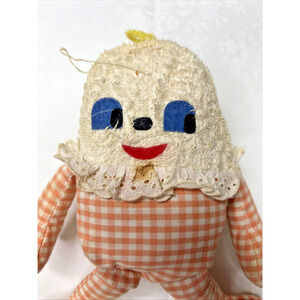 Vintage 1950s Humpty Dumpty Plush Doll Chenille Head Gingham Body Lace Collar Ha