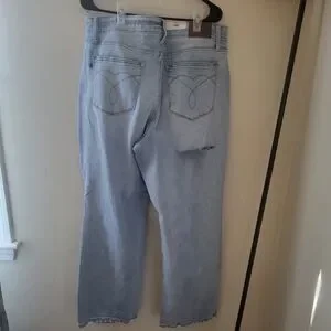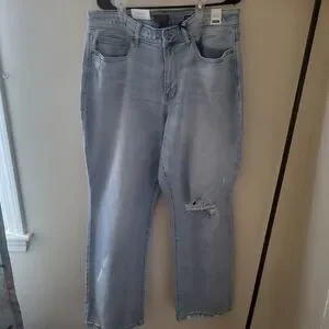 These high waisted straight fit jeans are still new with tags! They have a ripped design. The waist across is 18". The rise is approx 12". The inseam is approx 29".