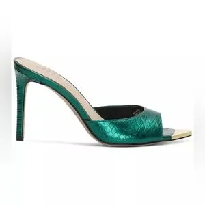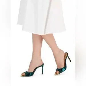 Elegant green open-toe heels with gold accents. Perfect for a night out.