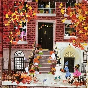 This Halloween and Fall themed puzzle captures the young wonders of the holiday. Children are dressed up ready to go trick or treating in the neighborhood in their best costumes. Embrace the nostalgia by piecing together this vibrant 500-piece puzzle while rain trickles down the windows and the fall leaves blow into the wind.