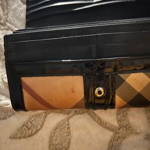 Burberry Supernova full size women's wallet in a nova penrose. Features black patent leather trim. The wallet is very clean! Call out is one small black dot when you first open the wallet, it can not be seen when wallet is closed. I bought this myself from Nordstrom back in 2006. 100% Authentic!