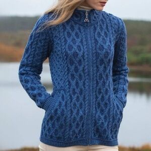 Vintage Icelandic Design Cardigan Sweater Speckle Cableknit Wool Classic Blue L