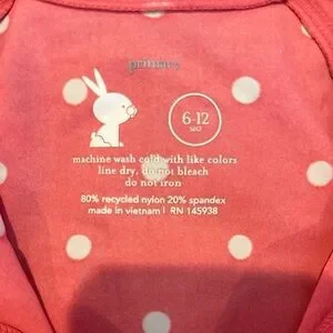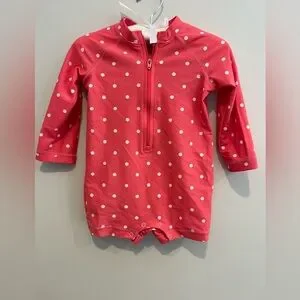 Charming pink rash guard bathing suit one piece with playful white polka dots. Primary brand 6-12 months.