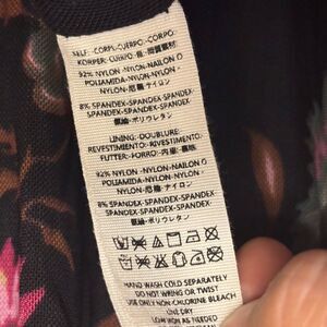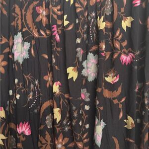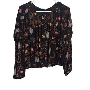 This is a preowned top from free people. With a relaxed fit and a flowy floral print this black multicolor top is the perfect pairing for fall or summer. It is made of a nylon/spandex blend giving it a flowy overall fit with balloon sleeves that feature girdles below the shoulder. This top is a great feminine closet addition. No holes stains or flaws.