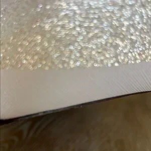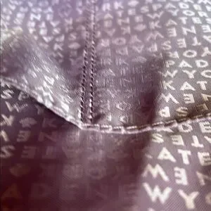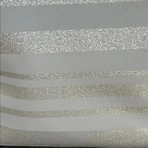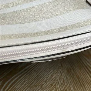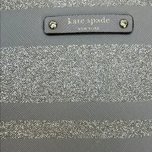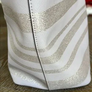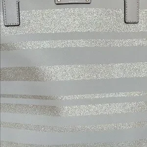 EUC Lavender Kate Spade glitter striped tote. I just noticed a tiny stain where it zippers. It is in photos. This is a beautiful tote , it can be used for every day use or special occasions. The demensions on this bag are approximately 19” W X 12”LX B 6 1/4”. Any questions please leave a comment below.