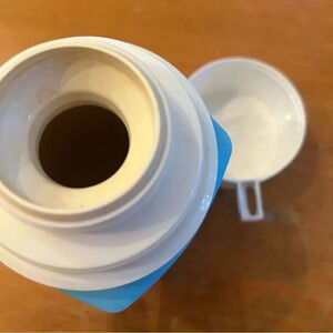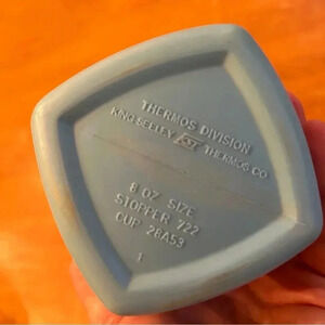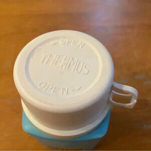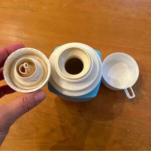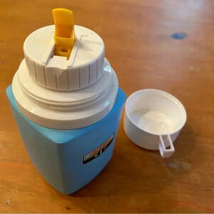 GUC antique vintage 8 oz thermos - 1980s school lunchbox size. Baby blue. Yellow spout and white lid/cup. Only some discoloration around the spout and white parts. Plastic could be bleached if you chose.