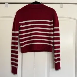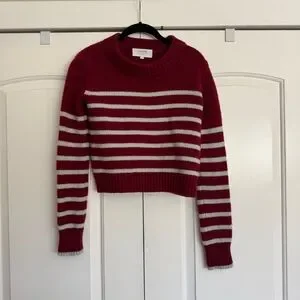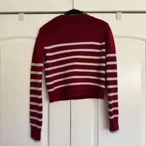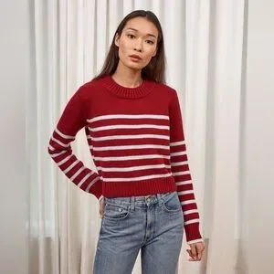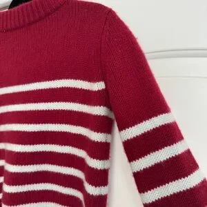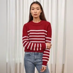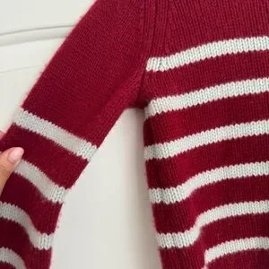 Get on board with our burgundy with pale blue stripes, 7-ply wool-cashmere sweater, shrunken and slightly cropped, but as always, comfort and style not mutually exclusive.