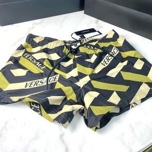 Stylish Versace swim trunks. Bold black and yellow design. Comfortable fit.