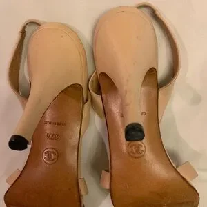 Stylish beige heels with sleek straps. Features iconic CHANEL logo. Ideal for chic outings.