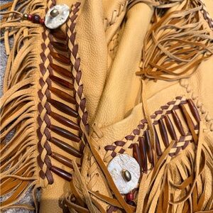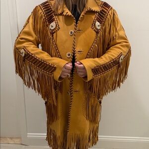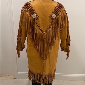 Stylish rusty dorr tan deerskin leather jacket with intricate fringe detailing. Perfect for adding a bold touch to any outfit.