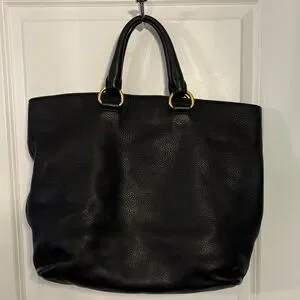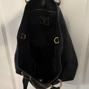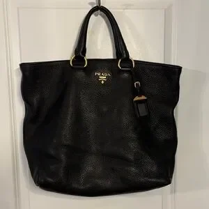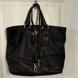 Stunning large capacity black pebbled leather Prada tote with top handles and adjustable/removable crossbody strap. Gold accents. Excellent used condition.