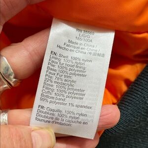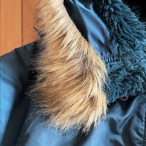 Keep warm and stylish with this teal blue fur-trimmed hooded jacket made for freezing temperatures. Snap front placket and metal zipper work great, snap hand warmer pockets, sleeve zip and pen pocket. Neck size tag removed but size on label clearly visible as Men’s Large.