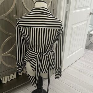 Stylish black and white striped blouse with an asymmetrical design. Perfect for a chic look.