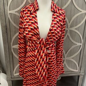 Stylish silk geometric pattern dress. Features bold brown, red and orange design. Long sleeves with front tie detail. Perfect for a chic look. 1/2 open stomach opening and tie up front. Simply beautiful, definitely a head turner