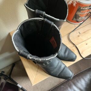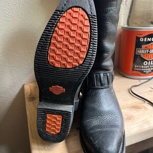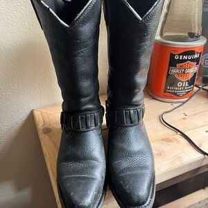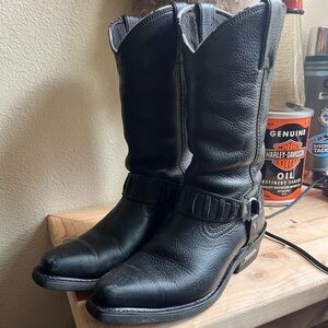 Rugged black leather boots with classic western style. Features sturdy construction and iconic branding. Ideal for motorcycle enthusiasts. Well loved and well-kept. Last worn on my wedding day at a farm so there may be some dust in the crevices.