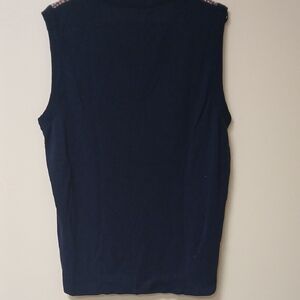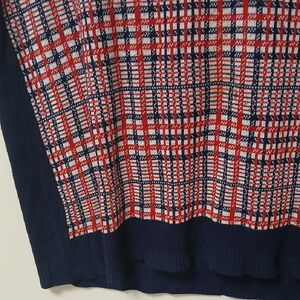 Stylish sleeveless sweater vest with a navy and red plaid pattern. Perfect for layering.