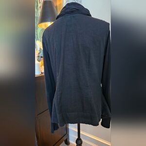 Can be worn Buttoned or open. Its super pretty. Light weight. Super Jet Black, no fading.