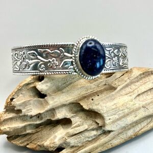 This sterling silver cuff bracelet is a stunning piece of jewelry that combines elegance with a touch of celestial charm. The intricate floral pattern etched into the silver cuff adds a layer of sophistication, while the blue Goldstone stone at its center provides a pop of color and visual interest. The smooth interior ensures comfort against the skin, making it suitable for everyday wear. Item 701