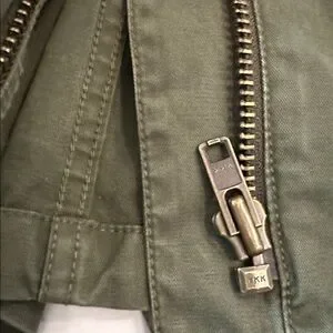 Chic khaki green jacket with snap buttons and zipper. Perfect for layering. Front pockets. Some faded markings but no rips or tears.