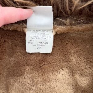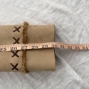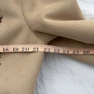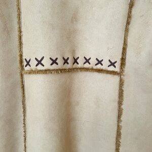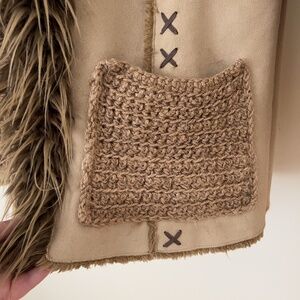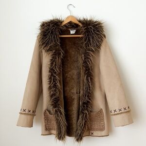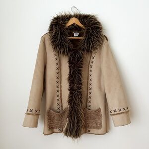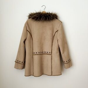 Stay warm and stylish with this elegant tan coat featuring luxurious faux fur trim. Perfect for any occasion.