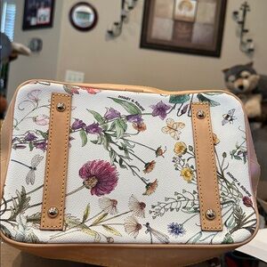 Chic floral butterfly π¦ ππ print bucket bag with tan accents. Perfect for adding a touch of elegance to any outfit.