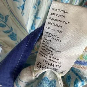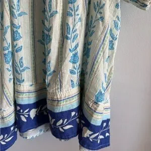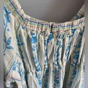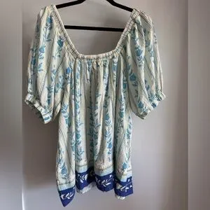 Free People Bohemian Santorini Floral Print Puff Balloon Sleeve Empire Waist Cream and Blue Cotton Long Tunic Top. Size Large, open fit. Approximately 23-24 inches from pit to pit and 32 inches from top of shoulder to bottom. New with tag condition.