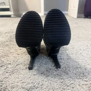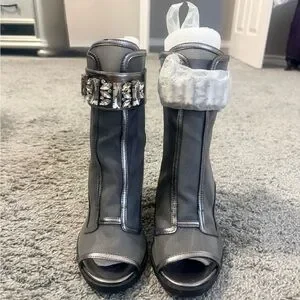 New, never worn Karl Lagerfeld Sophisticated heeled boots with silver accents. Peep-toe design for a modern touch.